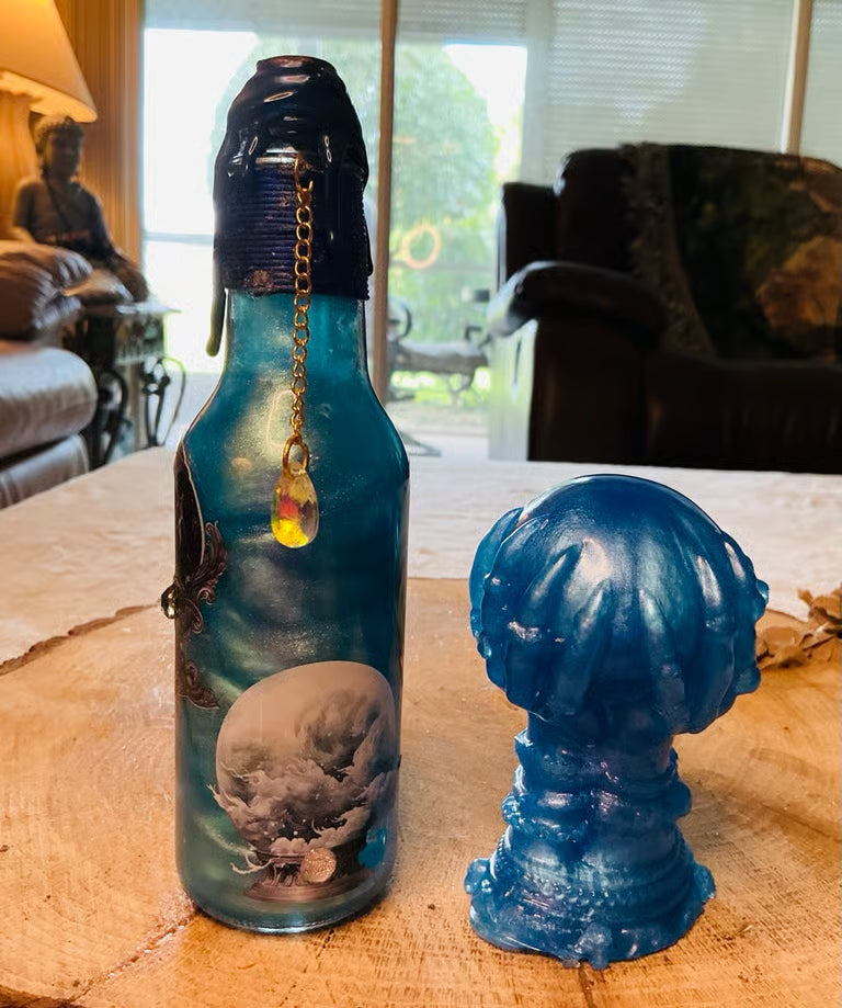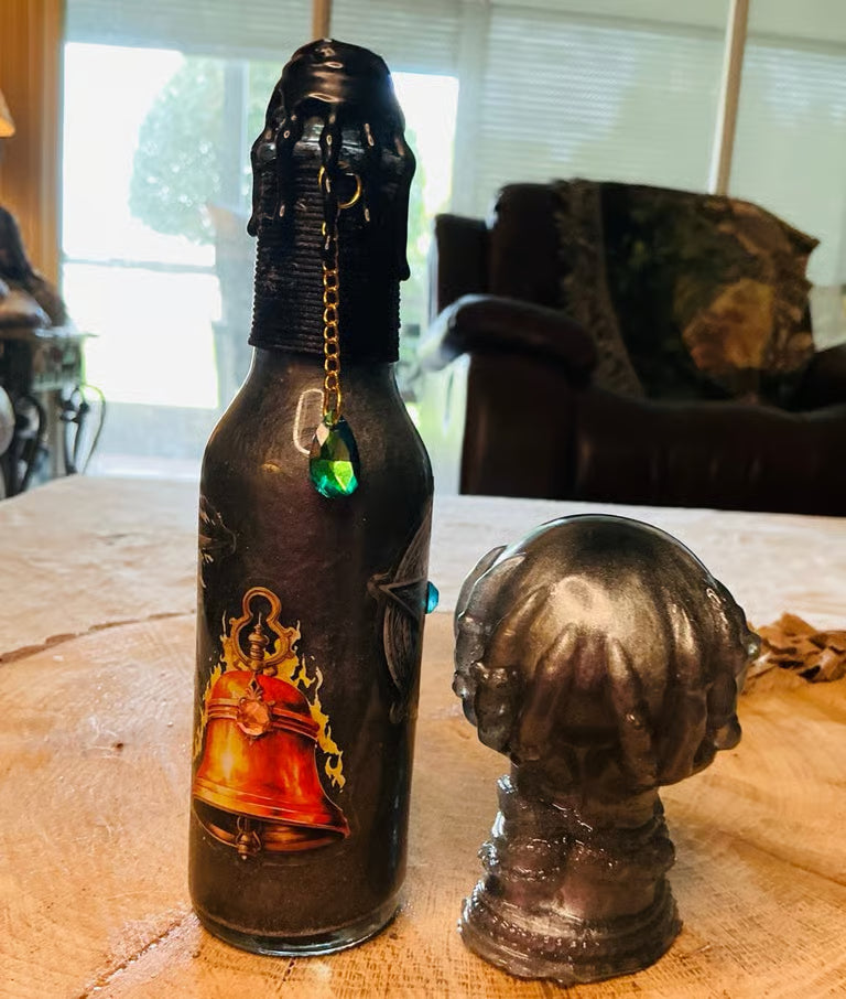 This is The Witches Brew Series. The crystal ball is sold separately. I hand make every bottle. If you’re interested in buying one, please message me about which one you would like. I use a variety of new glass bottles, isopropyl alcohol, alcohol inks, food coloring, distilled water, mica powder, glitter, different labels, stickers, decals, different colors of twine, variety of charms, corks, glue, wax seals. Great for centerpieces, weddings, bridal and baby showers, christening, theme favors, unique, quirky, parties, renaissance fair, cosplay, dnd, birthdays, Halloween, home decor, magic, LGBTQ+, or just because you like it. Mica powder settles. Hold charm, turn bottle upside down and shake gently